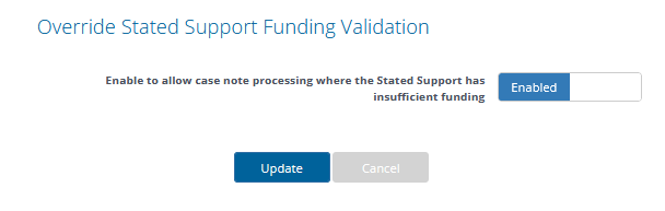 3. The Override Stated Support Funding Validation screen displays. Set the toggle box to Enabled and click on Save.