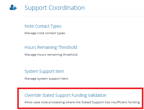 2. Navigate to the Support Coordination settings, and click on Override Stated Support Funding Validation.