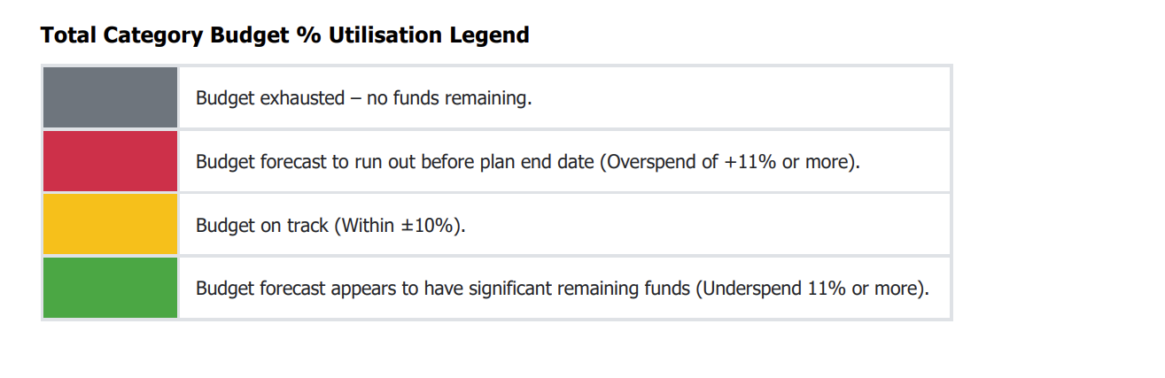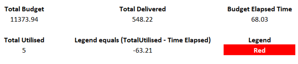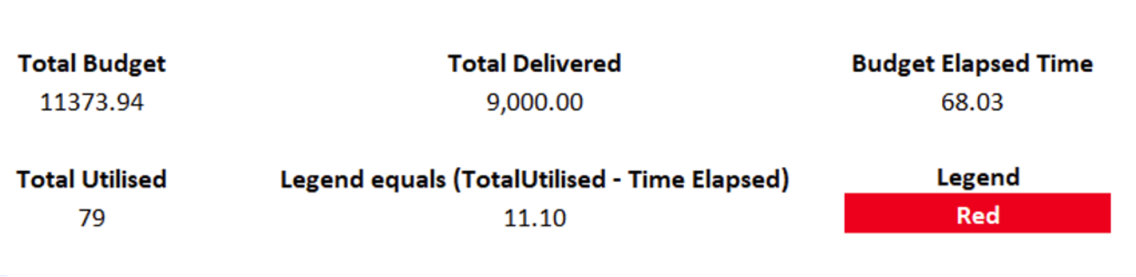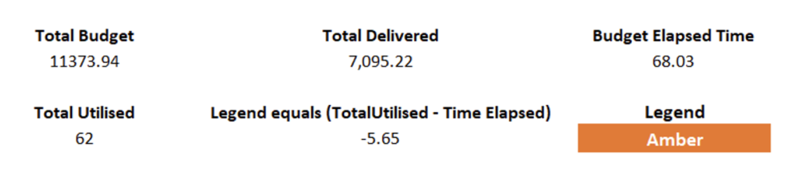 - Where (% Used - Time Elapsed %) is within +/- 10% the Legend equals Amber (Budget on track)