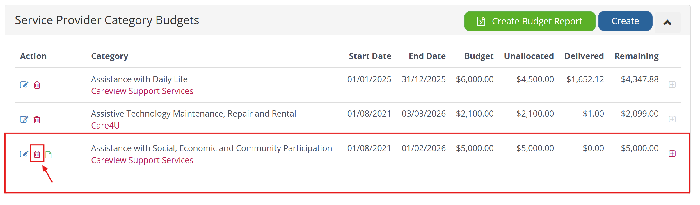 Provider Category Budgets table, under Actions click on the Delete icon next to the Budget you wish to remove.