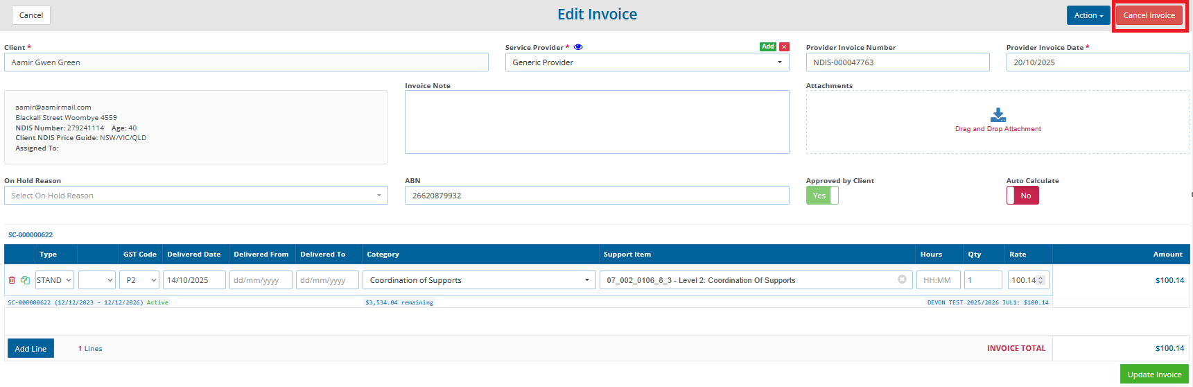 Please note an Invoice cannot be edited if the status is Provider Paid.