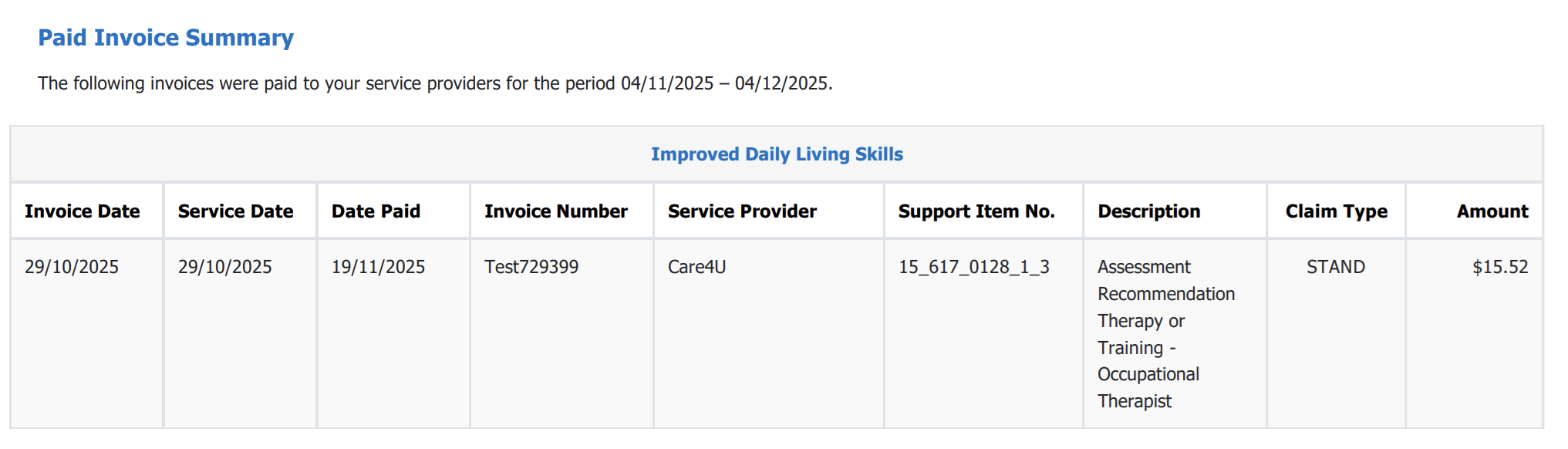 Depending on what option your Plan Manager has chosen, you will either see a Paid Invoice Summary or a Full Invoice Summary section.