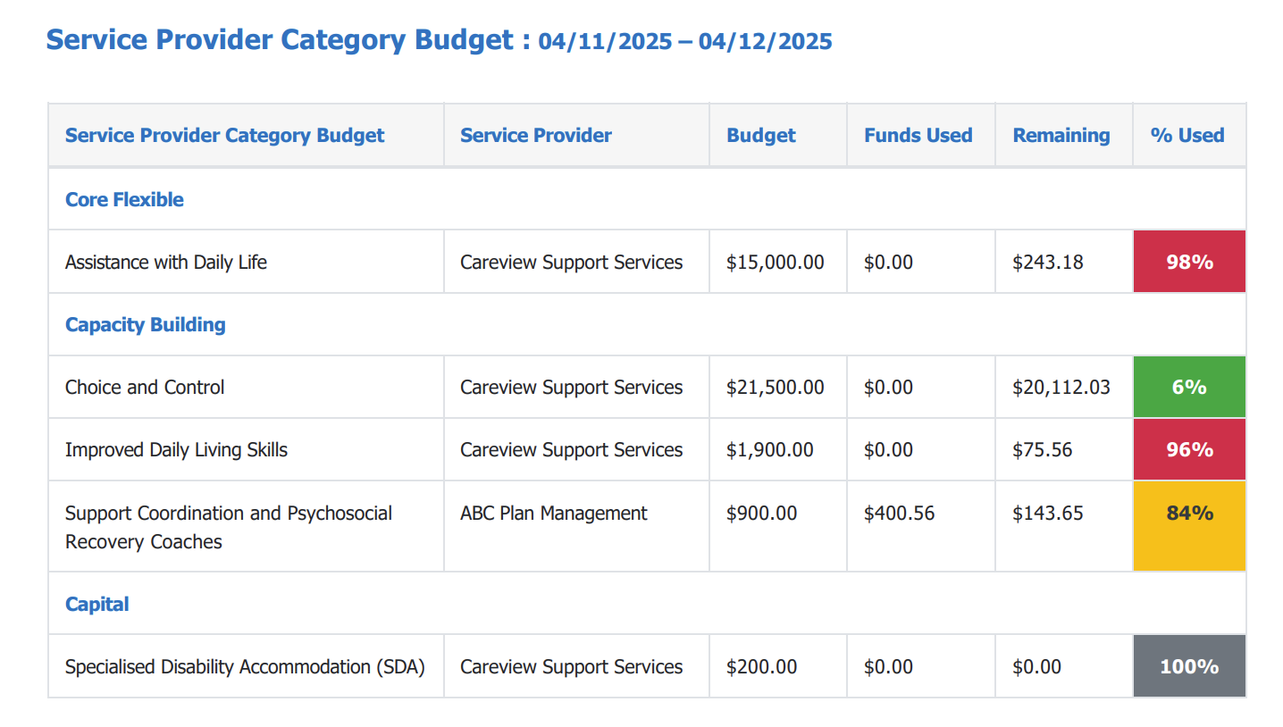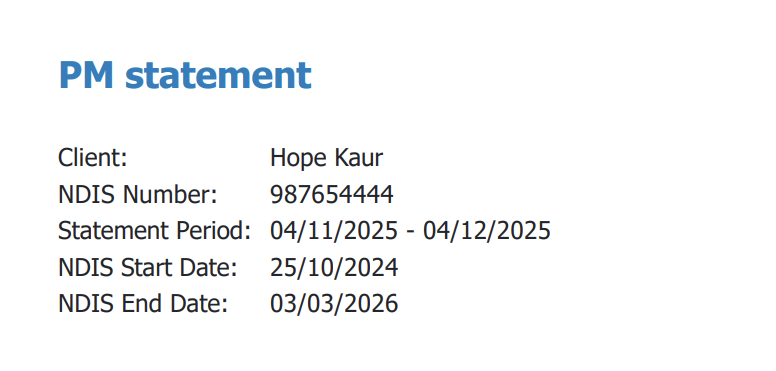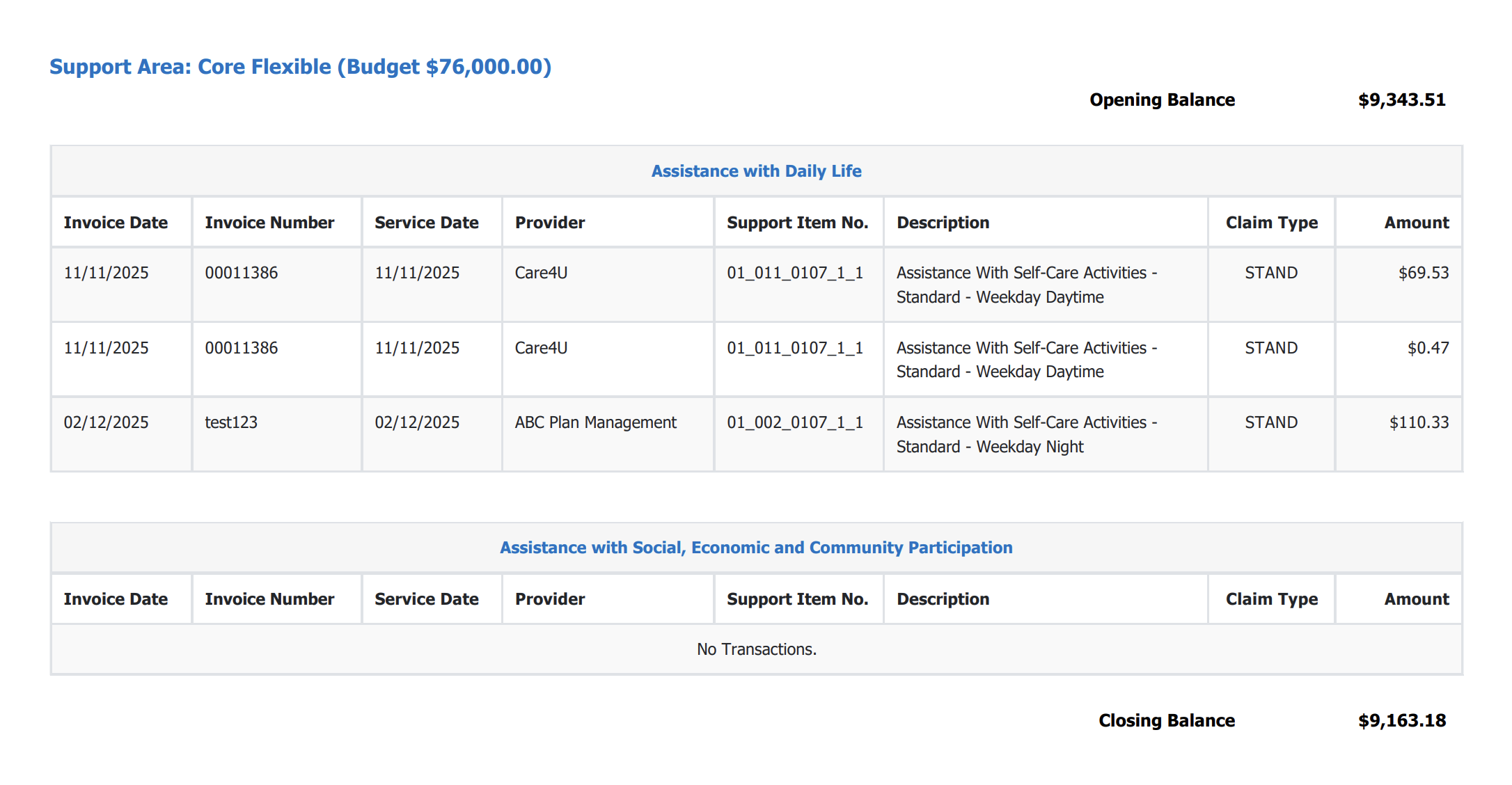 This will outline the opening balance for the support category ( first date of the statement period), the funds used will be related to the Services that have been delivered during the statement period, and the closing balance will be what the funding amount is at the end of the statement period.