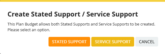The Create Stated Support/ Service Support dialog screen displays if the Stated Support Type has been set to Stated - Any Category Supports Only.