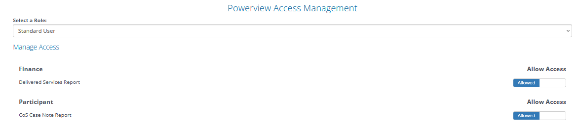 5. Set the Allow Access toggle box to Allowed for the specific reports you wish all users within the selected User Role to gain access to as pictured above.