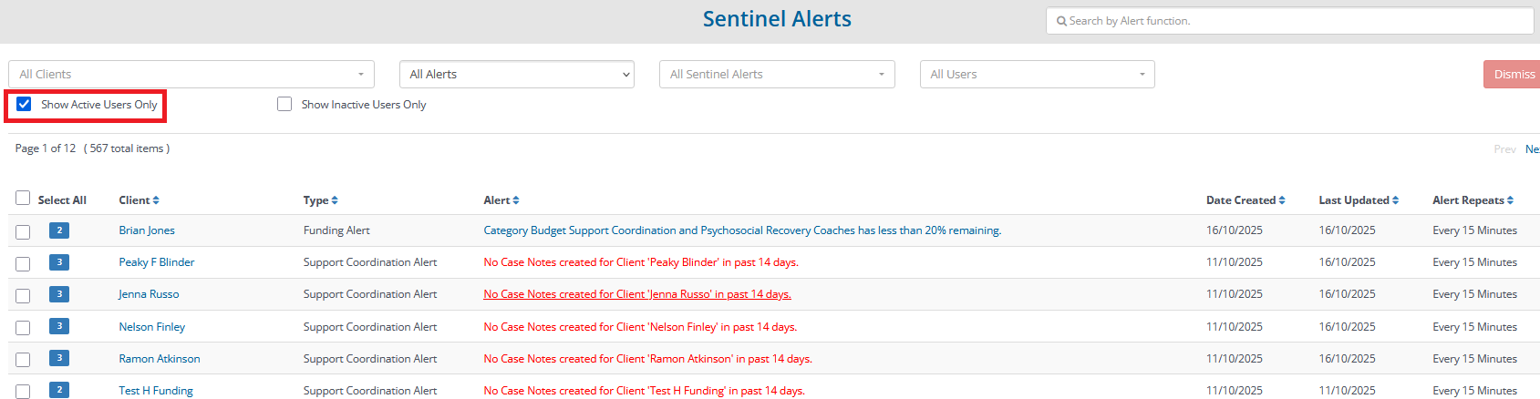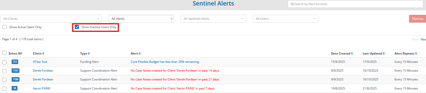 Click to select the Show Inactive Users Only checkbox to display alerts relating to Inactive clients and the All Users filter will only contain Inactive Users..
