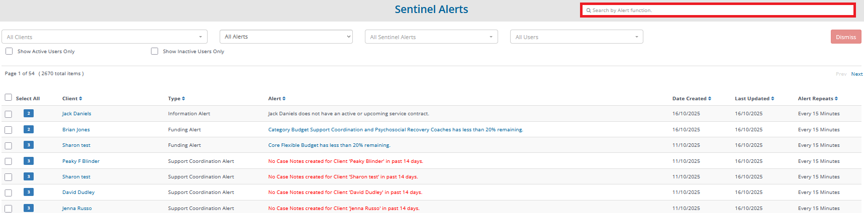 Once any of the alerts have been enabled, the Client Name will display in red in the Support Coordination Client List, to indicate there is an active Sentinel Alert.