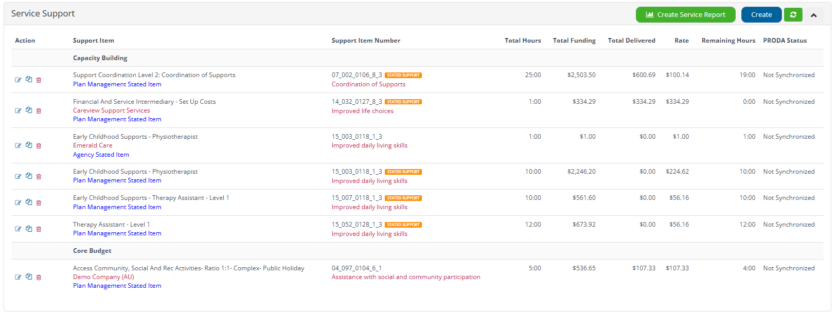 - Once the new Service/Stated Support is saved it will then be visible from the Invoice Entry screen or Support Coordination Client list.